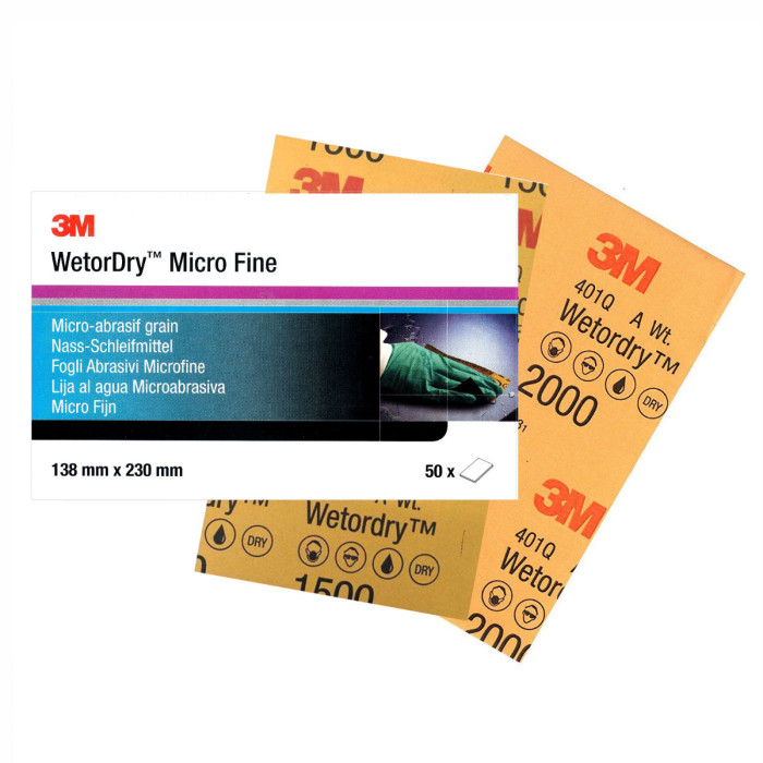Bruk 3M™ Wetordry™ Slipeark 401Q for sliping av alt som trenger en finkornet sliping, spesielt korrigering av lakkfeil. Med en kombinasjon av den slitesterke, vannmotstandige og A-vektede papirbaksiden og hurtigavvirkende silisiumkarbid-mineral, gir slipearket vårt konsistente mønstre som er lettere å polere ut. Silisiumkarbid er et ekstremt hardt mineral, som skjærer meget hurtig. De skarpe tuppene brekker lett. Resultatet er skarpe, eksponerte kanter – og en glatt, profesjonell finish. Bruk slipearket vått eller tørt, på lakk, grunning, gelcoat eller metall. Brukes våt for å redusere støv og at arket fyller seg.