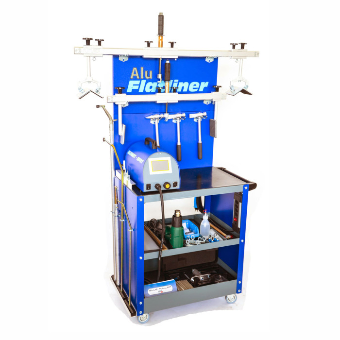 Komplett arbeidsstasjon for platereparasjon på aluminiumskader. Reparasjonsmetodene for aluminium kan variere avhengig av type skade, men også de forskjellige legeringene som brukes. Derfor er det viktig å integrere alle metodene i ett system. Alu Flatliner arbeidsstasjon inneholder alt verktøyet som er nødvendig for en profesjonell aluminiumsreparasjon.