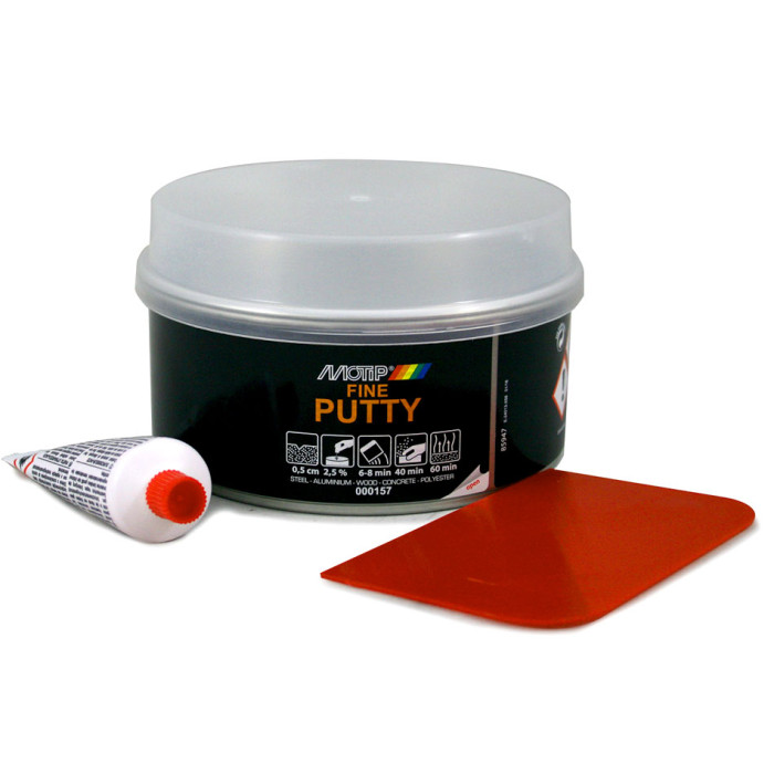 Jevn ut små ujevnheter i overflater av stål, aluminium, tre, betong og polyester på bilen din med MOTIP 2-komponent Fine Putty. Fine Putty er lett å slipe, elastisk og kan sprayes på nytt med alle lakksystemer. Fine Putty har en veldig fin struktur og utmerket vedheft og er motstandsdyktig mot kjemikalier og vær. MOTIP Fine Putty kan påføres i lag med en tykkelse på opptil 0,5 cm.