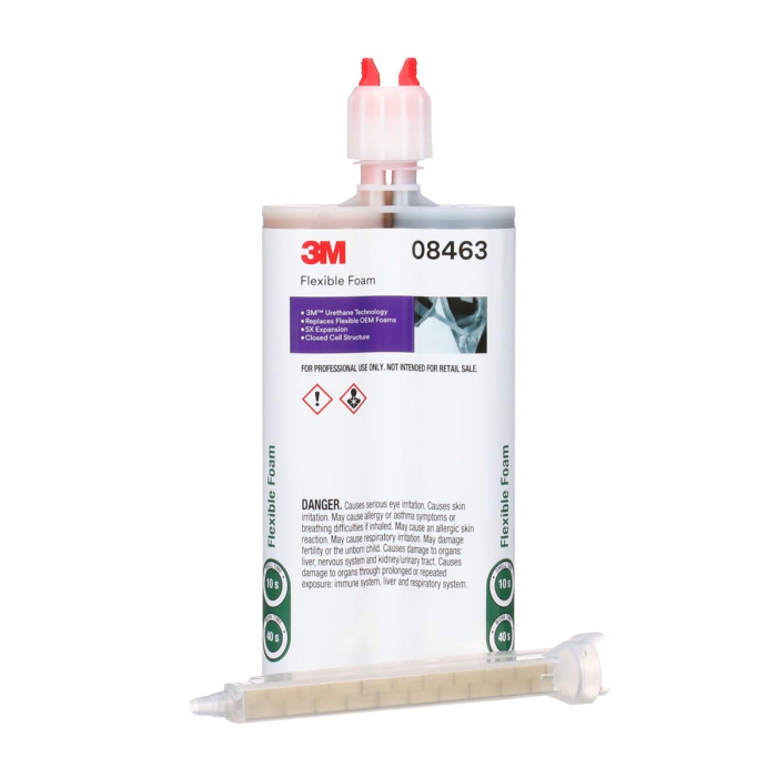 3M Fleksibelt skum er et mykt og fleksibelt to komponent uretanmateriale som skummer på stedet (lukkede celler). Det er designet for å erstatte OEM fleksibelt skum som finnes på forsterkerstolper i dører, takbuer, innsiden av karosseripaneler, søyler og i andre karosserihulrom. Utvides til 10 ganger det opprinnelige volumet sitt, for å fylle store hulrom med en liten mengde materiale. Kan brukes for å bytte ut originale fleksible skum til tilstanden de var i før ulykken, så langt det er mulig.