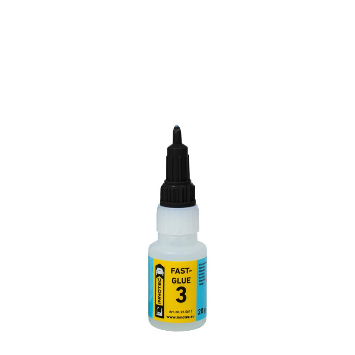 Fast-Glue 3 er den høye viskositetsvarianten. Dette er egnet til liming av harde materialer som metall og hard plast. Kan brukes med stor effekt, for eksempel til styrking av sprukne borehull og liming av ødelagte klemmer. En annen fordel med den høye viskositeten til Fast-Glue 3 er at produktet kan påføres som en gel, slik at det ikke flyter av reparasjonsområdet som et superlim, men limer nøyaktig der det er nødvendig. På grunn av den praktiske emballasjen i 20 g flasker er Fast-Lim brukervennlig og enkel å påføre. På grunn av den gjenutsettbare, spisse dysen kan produktet doseres ekstremt nøyaktig og har lang levetid.