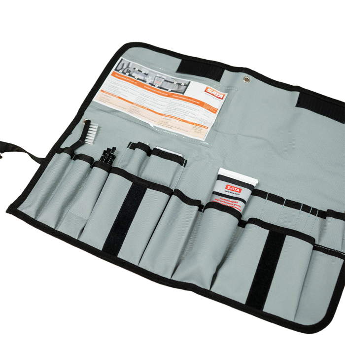 Med SATA Care set har du komplett rengjøring og vedlikehold lett tilgjengelig. Settet inneholder børster og spesialnåler som gjør det enkelt å rengjøre kappe, dyser og alle materialførende deler – helt ned til de minste hullene. Den silikonfrie SATA-smøringen sørger for at fjærene og justeringsdeler holder seg smidige og funksjonelle over tid. Alt leveres i en slitesterk og ryddig veske med god plass til verktøy og utstyr.