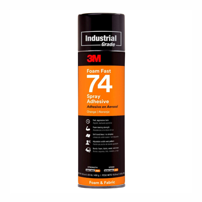 3M skum og stoff 74 spraylim har en aggressiv festeevne som gir høy øyeblikkelig vedheft med styrke som kan rive over skumplast, men som likevel har tilstrekkelig åpningstid for å plassere materialene på riktig måte. Innholdet har mye faste stoffer og støtter lave inntrekkingsegenskaper, slik at du har tid til å plassere delene for beste passform. Denne egenskapen gir også mer dekning enn konkurrerende spraylim og bidrar til å skape myke fuger uten «smilehull». Løkkemønsteret som sprøytes av dette ikke gulnende limet, kombinert med rask klebing, sterk vedheft og rent resultat, gjør det ideelt til prosjekter overalt i huset eller på arbeid. Anbefalte bruksområder: generell polstring, skumlaminering, feste skum og stoff til tre og andre substrater. Ideell for installasjon av akustiske paneler. 3M 74 spraylim kan lime skumplast og stoff på en lang rekke materialer, inklusive papir, papp, plast, metall, tre og mye mer.